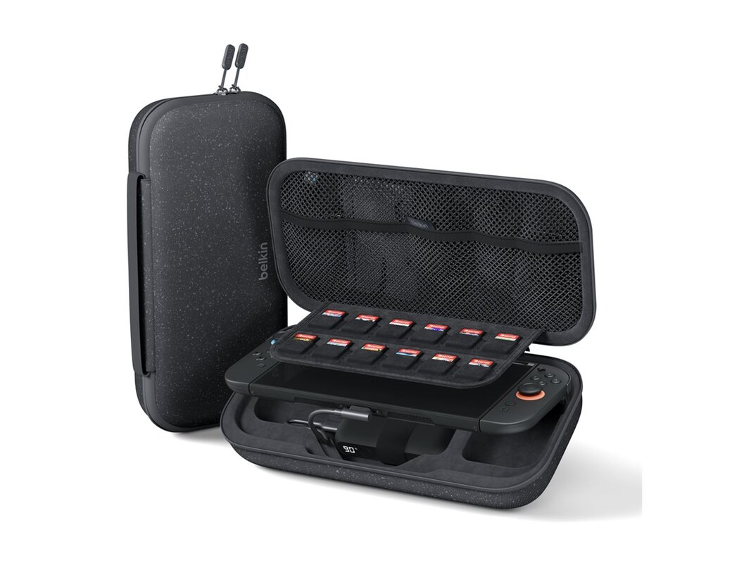 The Belkin Gaming Charging Case offers a versatile solution for gamers on the go. This case features a durable zipper closure and a handle wrap for easy carrying. With multiple compartments, including dedicated spaces for a power bank, game cards, and an AirTag pocket, organization is effortless. A kickstand groove provides added convenience for tabletop play. Additionally, the case boasts protection against water, scratches, abrasions, bumps, and drops, ensuring that gaming gear stays safe during travel.