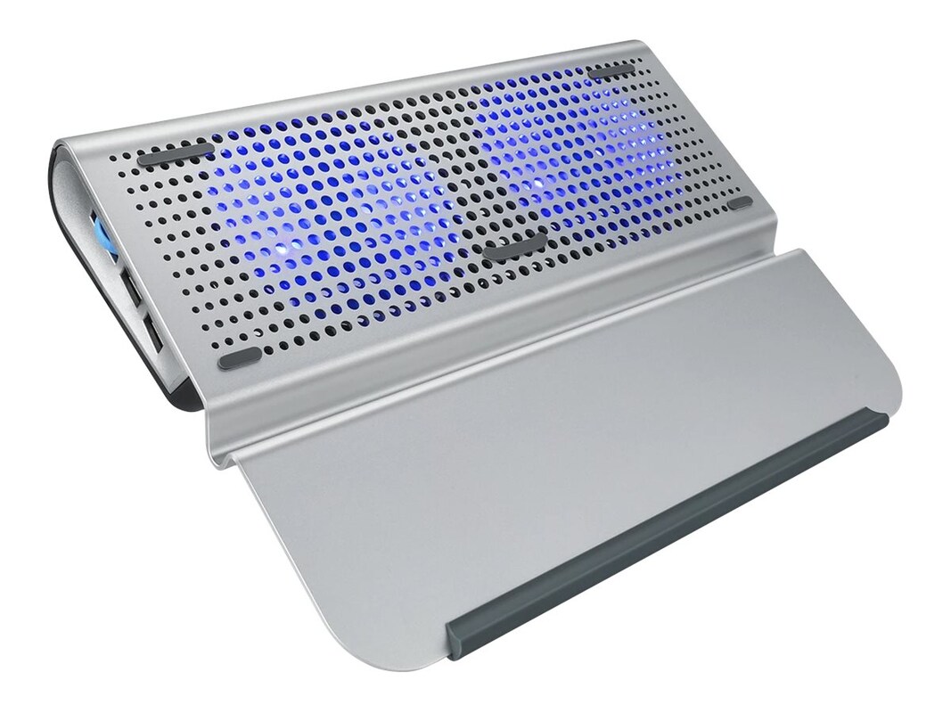 The OTM Essentials adjustable riser laptop stand helps raise your laptop to an ideal working position.