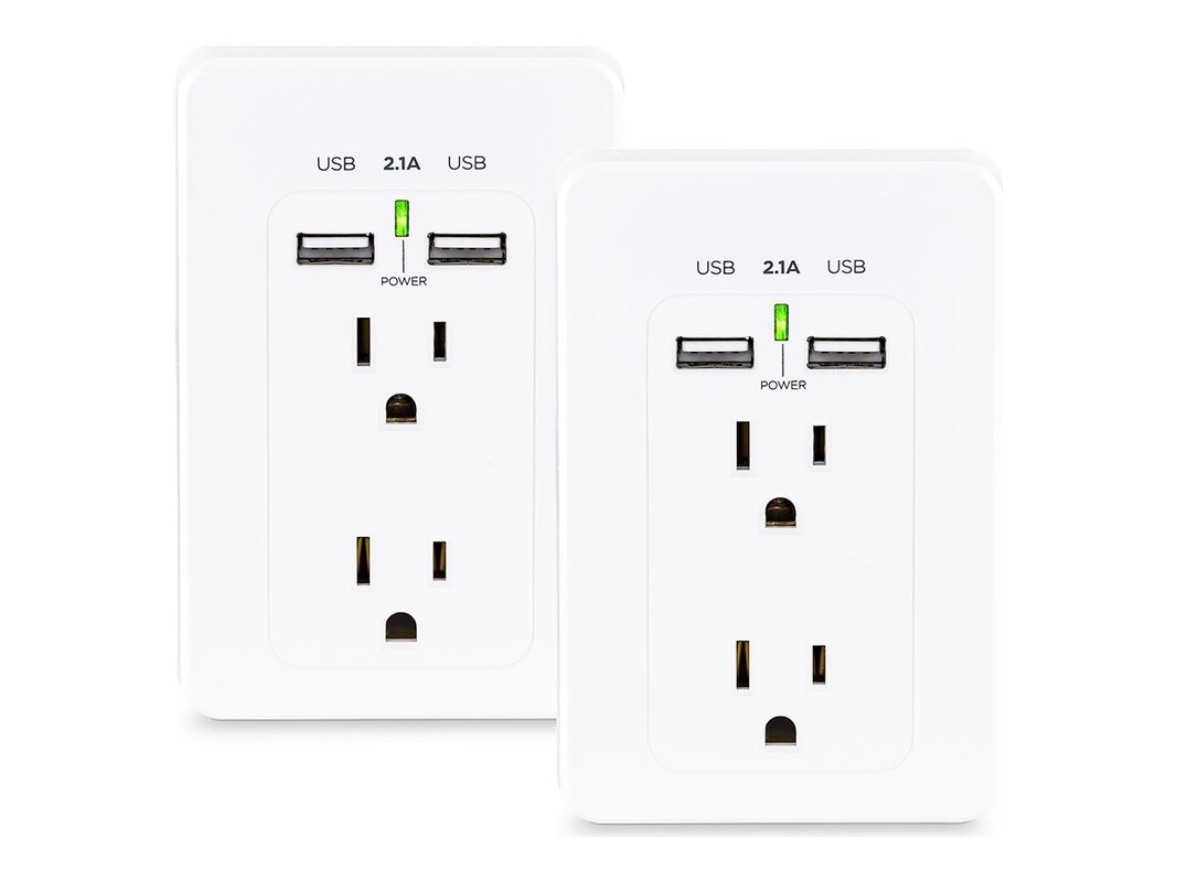 The CyberPower MP18HO007 Two Outlet Wall Tap Two Pack is ideal for charging your USB compatible devices in both the Home and Office. Each unit has 2 AC outlets, (2) 2.1A USB charging ports, and wall tap plug. The MP18HO007 is perfect for environments where USB charging is needed, but use of both outlets is a premium. The two (2) 2.1A USB charging ports can charge USB enabled mobile devices.