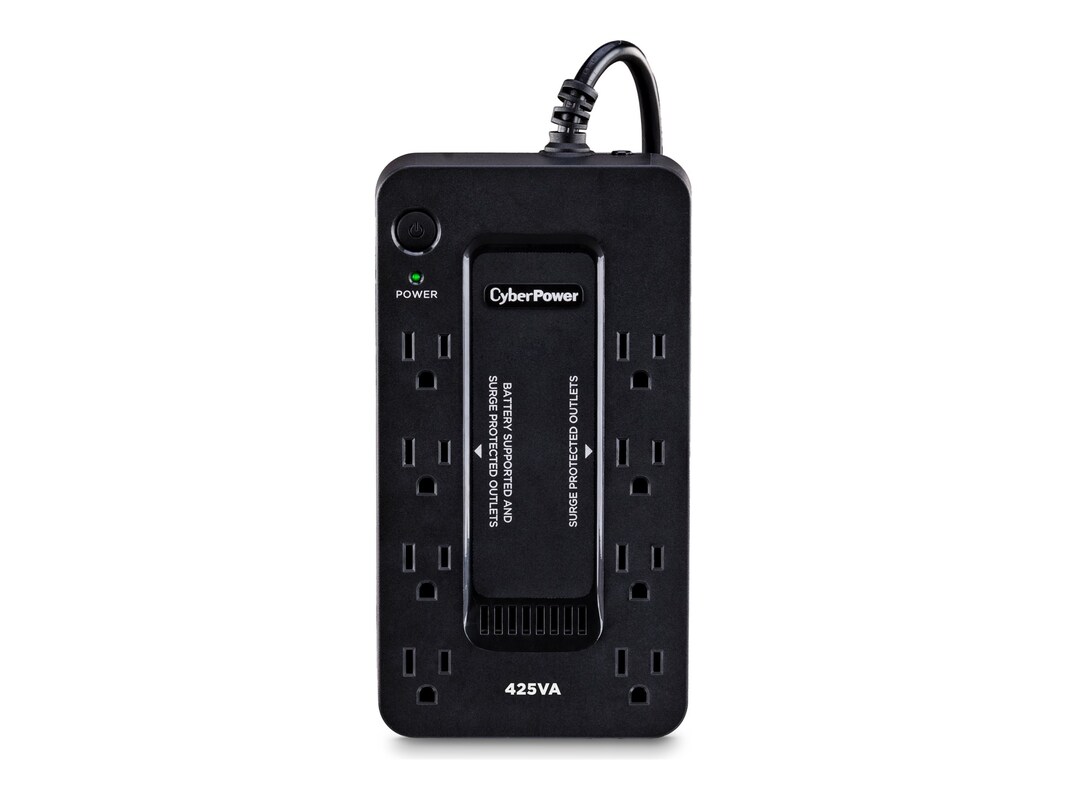 The CyberPower ST425 uninterruptible power supply (UPS) system provides battery backup and surge protection for lightning-induced surges and other power events that can damage electronic equipment. This unit delivers enough battery backup to power connected electronics through utility power failure and enough runtime to perform a graceful shutdown to protect against the loss of data and damage to valuable electronics during longer outages. Including a sleek design, this UPS is perfect for all your home office and entertainment needs, including computers, gaming consoles, and broadband routers.