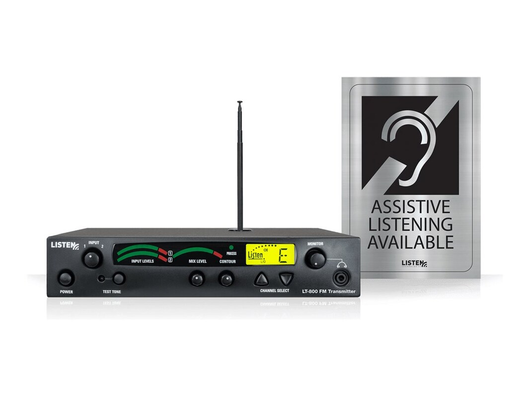Combining Listen Technologies Stationary RF Transmitter with the Telescoping Top-Mounted Antenna and Assistive Listening Notification Signage Kit, this complete package makes it easy to get your 72 MHz system installed and available to listeners right away.