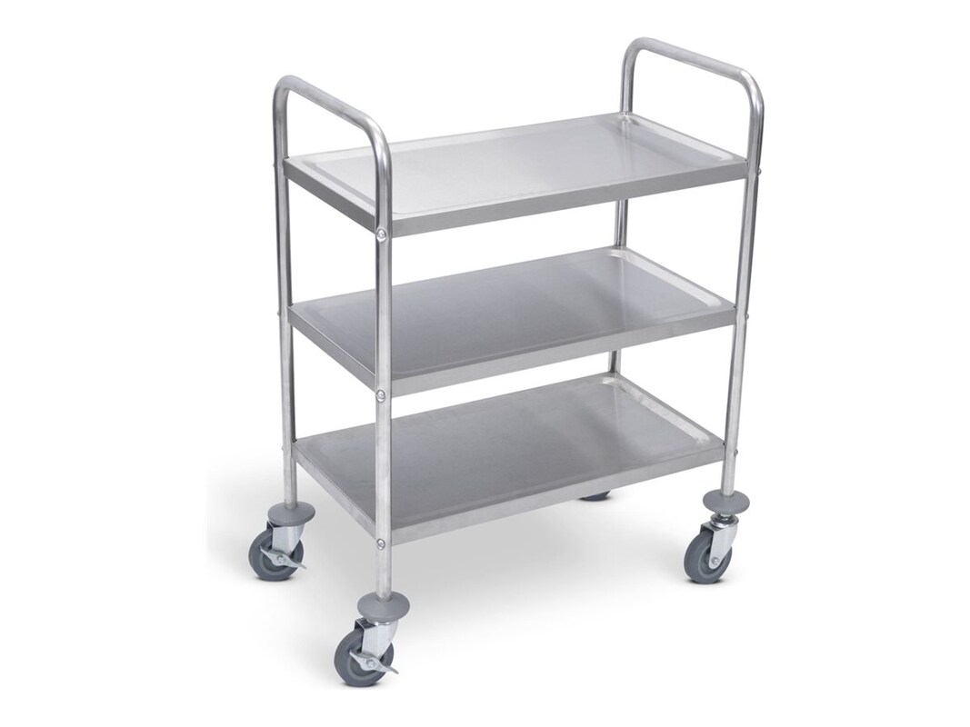 Highlights include three generously-sized shelves with retaining lips to help keep contents secure. Maneuvering the mobile cart through crowded aisles is easy thanks to comfortable, rounded handles on both ends. Four heavy-duty 4" swivel casters roll smoothly over a variety of floor surfaces, and two of the wheels offer locking brakes for times you need to keep the cart in place.